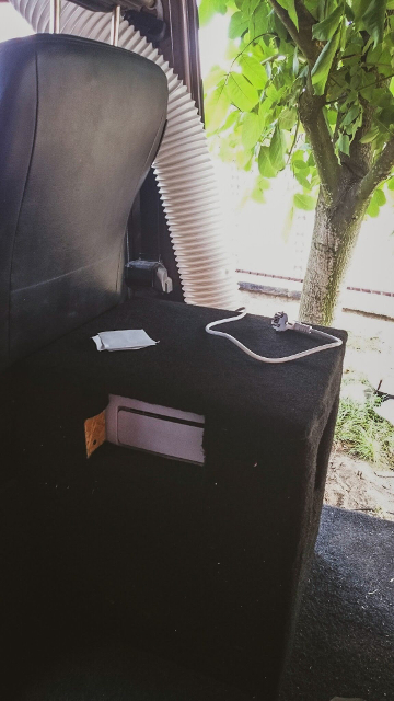 Klimatyzację chciałem początkowo też wrzucić do bagażnika, okazała się jednak 100mm za wysoka i trzeba było wymyślić coś innego. skonstruowałem więc dla niej wygodną skrzynkę z płyty OSB obitej dywanikiem samochodowym i umieściłem za fotelem pasażera. Przy okazji powstał mini stolik, lub bardzo wygodny podnóżek dla osoby jadącej na tylnym siedzeniu 😉