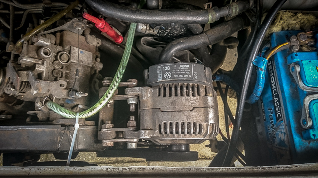 Zdecydowałem się na zakup tego Blaupunkta. Po zgłębieniu tematu okazało się, że mój busikowy alternator, oryginalny, trzystuletni, 65A, raczej nie da rady poborowi prądu rzędu 900W. Najmocniejszy alternator jaki można kupić do Volkswagena T3 ma 90A. To by nam może jakoś wystarczyło, klima miała pobierać około 75, zostawało 15A zapasu. Ponieważ nasz silnik, 1,9D 1Y, nie jest oryginalny, a w golfach, które miały klimatyzację montowali alternatory 120A, postanowiłem poszukać takiego.