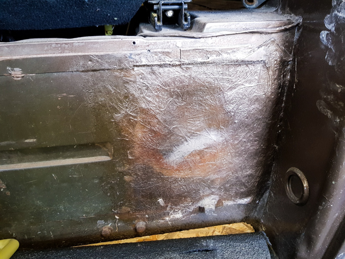 … śruba pękła. Dobra śruba – pomyślałem i podniosłem wykładzinę. Moim oczom ukazało się sporo rdzy i dziura. Zajrzałem pod spód, ale tam dalej wszystko wyglądało dobrze. Śrubokrętem usunąłem konserwacje z okolic dziury. Okazało się, że kanalia przykleił od spodu, w miejscu mocowania pasa dużą podkładkę, a następnie dziad zapaćkał wszystko konserwacją tak, żeby nie było nic widać.