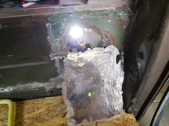Kolejnym zadaniem przed rozpoczęciem którego robiłem w gacie, było dorobienie dwóch kawałków słupka B. Przód słupka był konkretnie zżarty, a nie mogłem znaleźć żadnych gotowych reperaturek. Sprawa wyglądała poważnie, w rzeczywistości jednak okazała się dość prosta. Przed wycięciem skorodowanego kawałka, zrobiłem sobie szablon z kartonu. Byłem go w stanie dosyć dokładnie docisnąć, następnie, jeszcze na samochodzie, dociąć nożykiem do tapet, a potem rozprostować i odbić na arkuszu blachy. Tak przygotowany kawałek blachy wyklepałem na słupku młotkiem blacharskim i dopiero po tym wziąłem się za wycięcie zgnilizny.