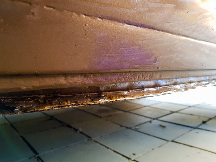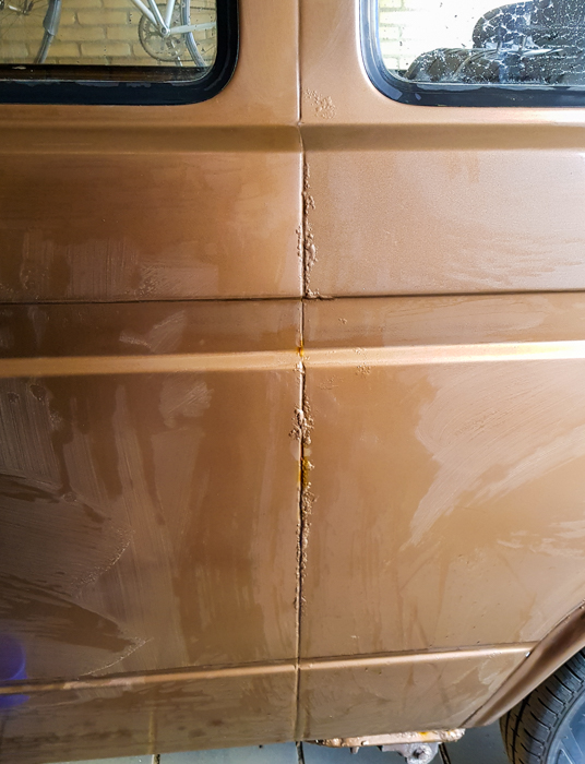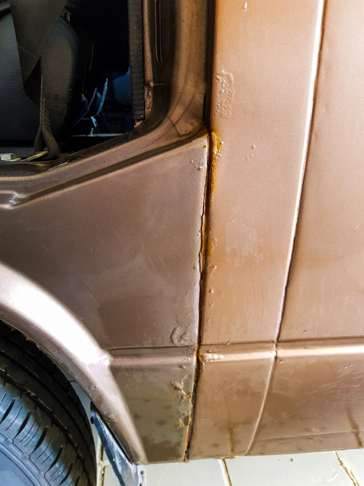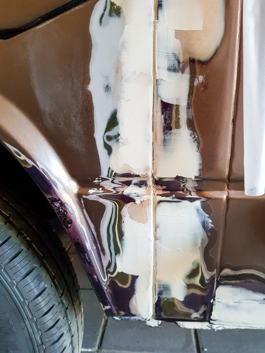 Najgorszym miejscem pod względem rdzy wydawał się tylny błotnik za lewym kołem. Tam po przygodzie z odkręconym kołem, o której kiedyś na pewno napiszę, wylazło na wierzch sporo rudej. Wyglądało to tak, jakby poprzedni właściciel mojego busa pomalował go prosto na rdzę (i pewnie tak właśnie było). Ze względu na tę rdzę przyprawioną dziurskami, wchodziła tutaj w grę tylko wymiana całego elementu.