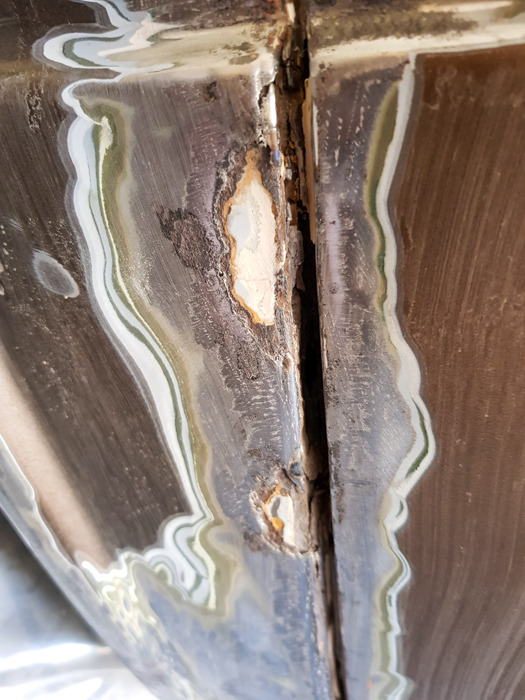Wracając do kitu, to jeśli chodzi o szpary pomiędzy łączeniami blach, kituje się je nim jak zwykłym silikonem. Z jednej strony nie ma tu wielkiej filozofii, z drugiej znów jak to przy silikonie, trzeba nabrać trochę wprawy żeby kłaść go bez maz i różnych dziwnych artefaktów. Maluje się ten wynalazek metodą mokro na mokro, nie trzeba więc czekać z nakładaniem podkładu aż do wyschnięcia masy. Przy okazji kitowania szpar, postanowiłem wypełnić również wyżej wspomniane dziury. Nie chciałem pchać w nie tony szpachli w obawie przed tym, że szybko popęka (ciekawe ile to teraz wytrzyma). Po wypełnieniu szczelin psiknąłem wszystko jeszcze jedną warstwą brunoxa i zakończyłem szychtę.