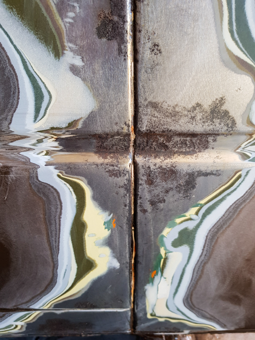 Oczyszczoną z mieszanki rdzy, ton szpachli i starego lakieru blachę przemyłem zmywaczem silikonowym i pokryłem Brunoxem epoxy. Jest to połączenie konwertera rdzy i podkładu epoksydowego. Wybrałem go ze względu na łatwość użycia i pochlebne opinie o nim krążące po internetach. Naturalnie wybrałem wersję w szpreju. Nakłada się go w 3-4 warstwach w odstępie około 40 minut, a następnie należy odczekać 24h do całkowitego wyschnięcia. Miejsca pokryte Brunoxem, po jego wyschnięciu zrobiły się czorne jak Black Metal w środku nocy. Starzy górale mówią, że to dowód na jego działanie.