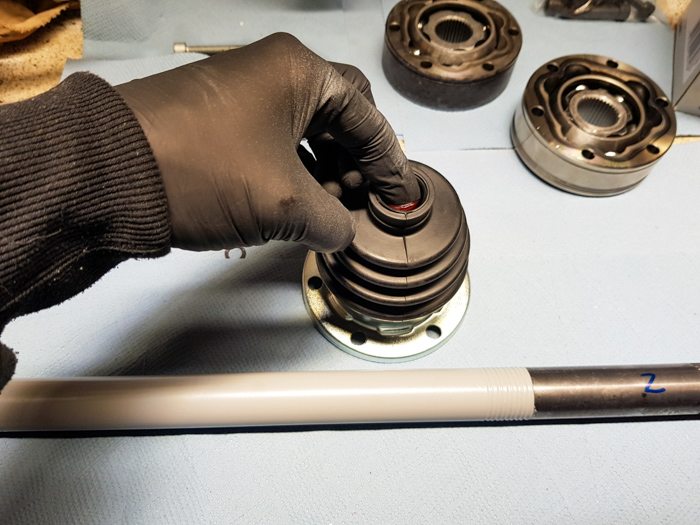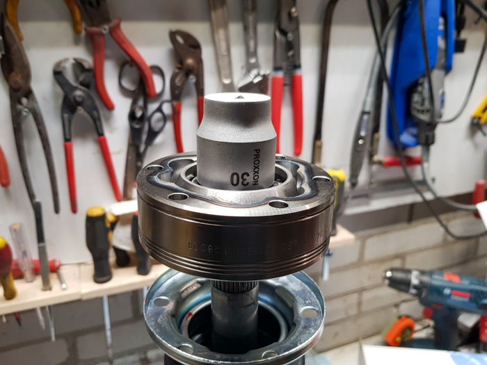 W pierwszej kolejności na wał półosi nasuwamy osłonę przegubu. Tutaj sprawę ułatwi delikatne nasmarowanie kołnierza osłony żeby się nam łatwiej wślizgnęła 😉. Następnie zakładamy wcześniej złożony do kupy przegub, pamiętając, że fazkę na koszyku zawsze kierujemy do środka półosi. W moim przypadku, żeby nabić przegub na wał, założyłem na piastę nasadkę 30mm i gumowym młotkiem wbiłem dziada na miejsce. Polecam dać troszkę smaru na wielowypust wału, wtedy przegub też łatwiej się wślizgnie. Przegub wbijamy do momentu ukazania się rowka, w który następnie wpinamy pierścień zabezpieczający.