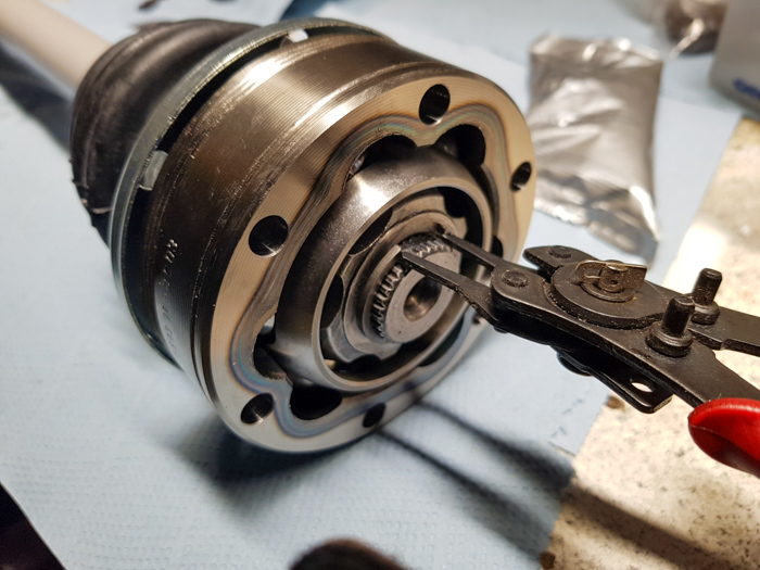 Po odkręceniu półosi w pierwszej kolejności zabrałem się za oczyszczenie i inspekcje przegubu od strony dziurawej osłony. Aby ściągnąć przegub z wału półosi należy najpierw usunąć pierścień zabezpieczający. Tutaj sprawę ułatwiły by pewnie specjalne szczypce, ale oczywiście ich nie miałem 😁. Zamiast nich użyłem szczypców seegera i małego śrubokręta. Nima sprawy, dało radę.