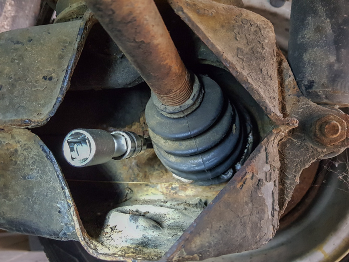 Pierwsze co więc zrobiłem, to nur do piwnicy w celu przeszukania moich tajnych rezerw. Są! Znalazłem dwie nowe osłony przegubów Löbro. Miałem więc komplet osłon na jedną półoś i mogłem brać się za robotę. Doszedłem do wniosku, że lepiej będzie zajrzeć najpierw do półosi, na której przegub miał mniejszy luz i sprawdzić czy trzeba go też wymienić. założyłem, że jeżeli ten z mniejszym luzem będzie do wymiany, to ten na lewej półosi na pewno też, bo tam luz był wyraźnie większy. Wtedy zamówię drugi komplet osłon razem z przegubami.