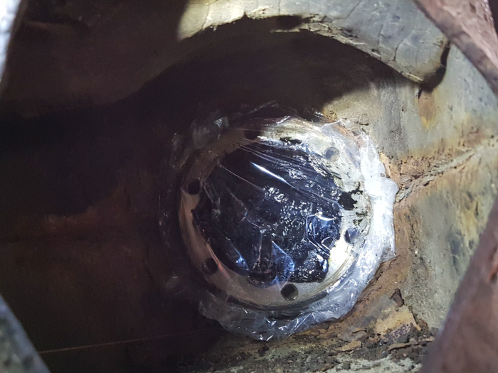 Śruby normalnie powinny być dokręcone momentem 45Nm. U mnie chyba tak było, przez co mimo iż były zdecydowanie wiekowe, nie sprawiły mi żadnego problemu podczas odkręcania. Wyskubałem najpierw z wnętrza łbów tyle syfu ile się dało – siedział tam piach, kurz i stary smar. Następnie delikatnie wbiwszy klucz w pasującą dziurkę śruby, ciach, pac, pyk, odkręciłem jedną po drugiej. Polecam zacząć odkręcanie półosi od strony koła. Można ją wtedy oprzeć w wahaczu zamiast trzymać na klacie podczas odkręcania z drugiej strony. Ponieważ nie byłem pewien ile czasu zejdzie mi na poskładanie tego wszystkiego z powrotem do kupy, owinąłem flanszę skrzyni i piastę koła folią co by się to wszystko nie syfiło.