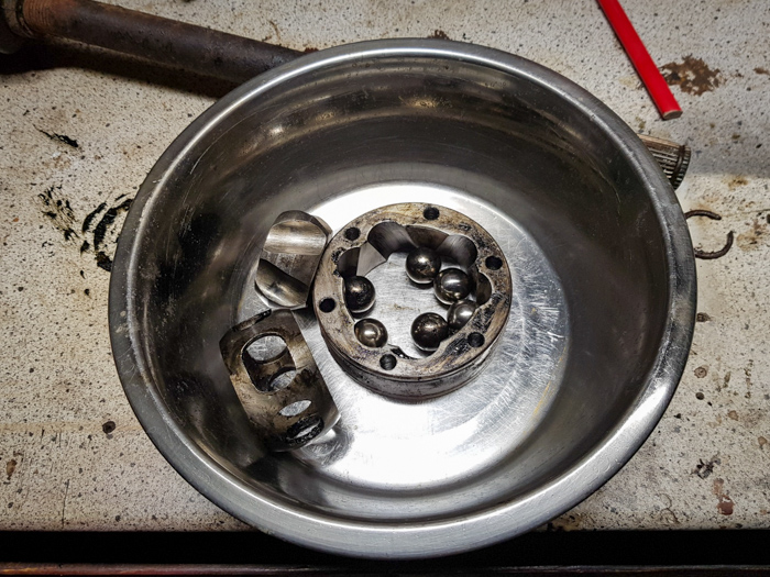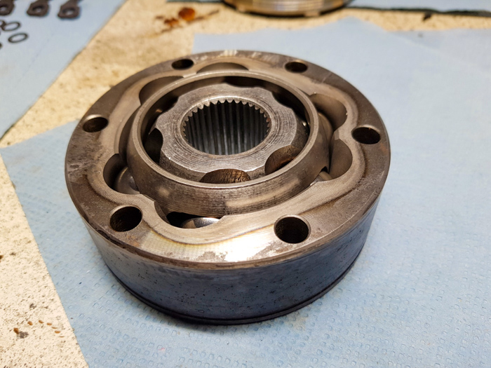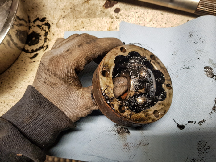 Po zdjęciu przegubu rozebrałem go. Aby to zrobić wystarczy przekręcić zewnętrzny pierścień o 90 stopni i wysunąć koszyk razem z kulkami i piastą przegubu. Następnie rozczłonkowanemu już przegubowi zafundowałem ropne SPA 😁