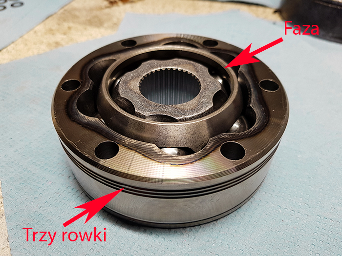 Następnym ważnym punktem jest to, że faza na koszyku oraz trzy rowki (nie ma ich w oryginalnym przegubie) na pierścieniu zewnętrznym, powinny zostać skierowane do środka półosi. Założenie pierścienia „fazą” do środka, daje przegubowi więcej miejsca na zginanie się i obracanie. Zakładając go odwrotnie, pierścień ten będzie dotykał piasty podczas maksymalnych odchyleń. Chwilę się co prawda wahałem kogo słuchać, zwłaszcza, że w każdym z moich nowych przegubów piasta założona była w inną stronę. Ostatecznie okazało się, że stare przeguby siedziały na półosi też w cały świat a jedynie wspomniana fazka na koszyku była zawsze skierowana do środka półosi.